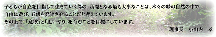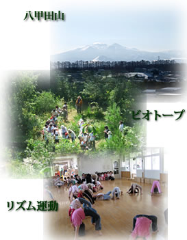 ・園舎は高台にあり、東に陸奥湾、南に八甲田山が見え、 眺めが良い。 ・南側にビオトープと芝生の遊び場、西側の裏山に林があり、自然環境に 恵まれている。 子ども達はその中で、泥だんご作りや虫捕りなど、夢中になって遊べる。 ・園舎は白い外壁で、屋内は採光がよく明るい。 40数年来リズム運動に取り組み、子どもたちの全身発達を育んでいる。 その他、絵本の読み聞かせやわらべうた、絵画・紙版画制作に 取り組んでいる。 ・子どもの成長を記録し、保育実践や日々の保育に生かすことで、保育内容の充実を 目指している。 ・生き生きと遊ぶ子 ・自分と相手のことを考える子